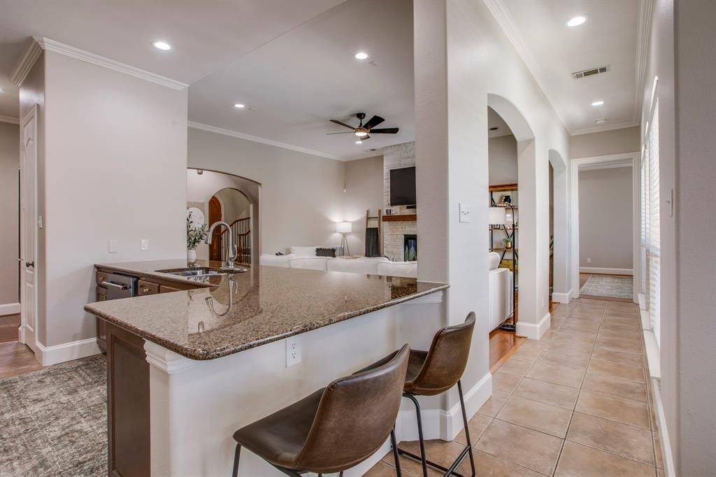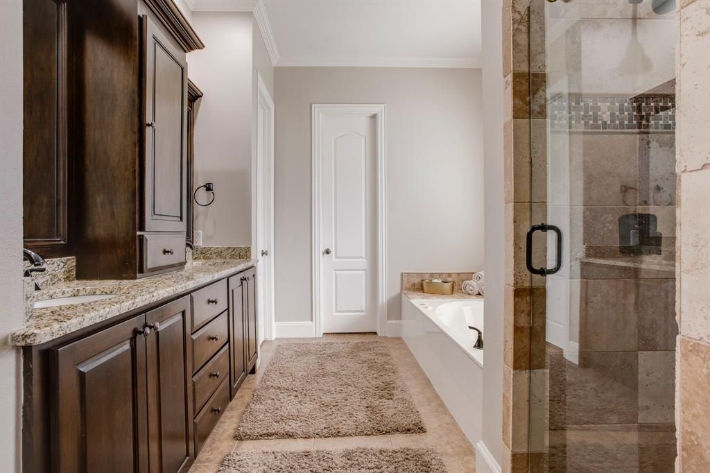 Welcome home to Stone Canyon in Sunnyvale! This gated neighborhood is known for its custom homes, great amenities, and a friendly community vibe. Sitting on a roomy corner lot, this well-kept home has plenty of space to spread out with 4 bedrooms, 3.5 baths, a study, dining room, media room, and a 3-car garage. The stone and brick exterior makes a great first impression, and the inside is just as welcoming. The open floor plan is filled with natural light and features wood-like floors, granite counters, stainless steel appliances, a coffee bar, and warm wood cabinets with updated hardware. The living area has a floor-to-ceiling stone fireplace, perfect for cozy nights in. The private primary suite is downstairs and offers a relaxing getaway with a tray ceiling, separate closets, and a spa-style bath with travertine tile, a frameless shower, and a jetted tub. Upstairs you'll find three more bedrooms"”one with its own private bath"”plus a Jack-and-Jill bath and a great media room for movie night or gaming. Step outside and enjoy your own backyard hangout space with an inground play pool, covered patio, room for sun loungers, and a fenced side area for pets. A wood privacy fence keeps everything tucked away, with wrought iron fencing opening to the side yard. Stone Canyon offers so much to enjoy"”tennis courts, walking trails, ponds, and multiple community pools. You're just minutes from great schools, restaurants, shopping, and the highway, making everyday life easy. Well cared for and move-in ready"”this home truly checks all the boxes!